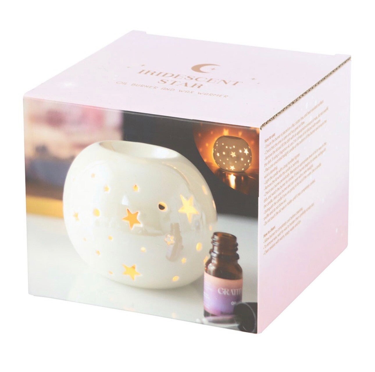 This white iridescent oil burner and wax warmer adds a beautiful blend of elegance and whimsy to any space.