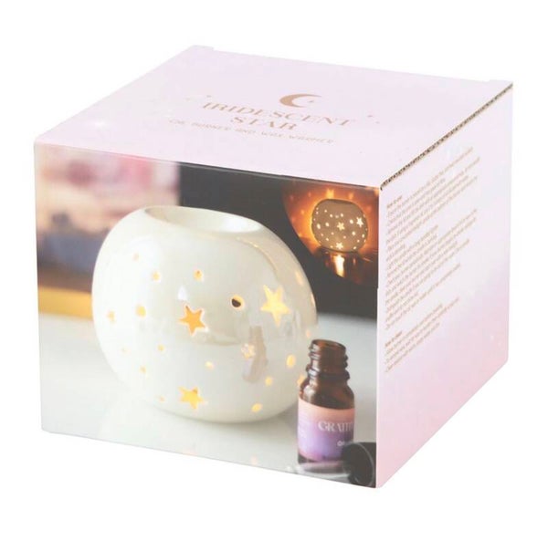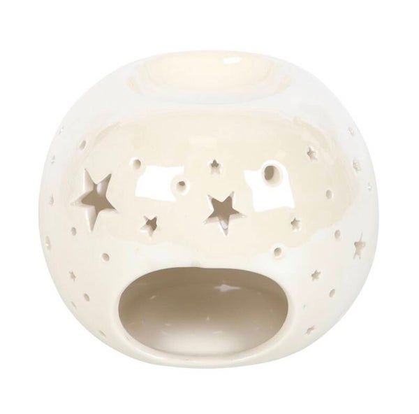 This white iridescent wax warmer and oil burner adds a beautiful blend of elegance and whimsy to any space. Its pearly finish shimmers in changing light, while the star-shaped cut outs project soft, starry reflections. Pair with a relaxing fragrance oil or wax melts and enjoy the soothing aroma and gentle glow.